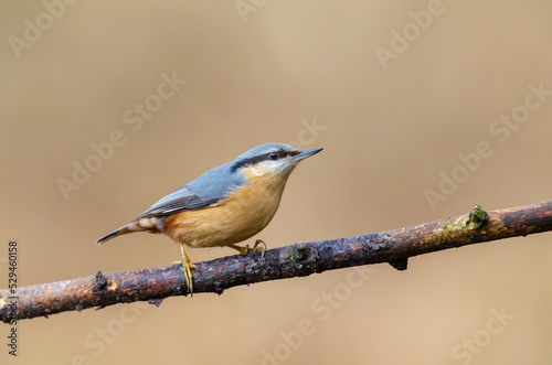 Fototapeta premium Nuthatch, Sitta Europaea, in a woodland setting perched on a branch, clear, beige background