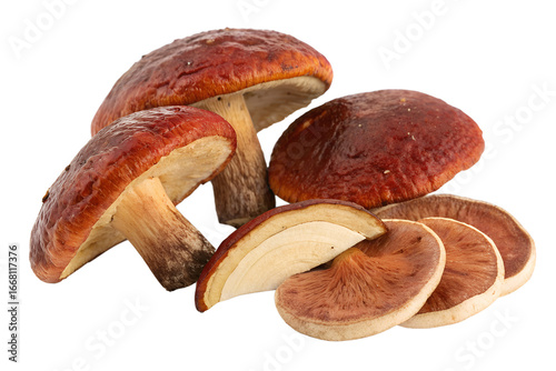 © Nipu, Fototapeta premium Nutritious and Earthy Mushrooms, Both Whole and Carefully Sliced, Photographed in a Studio Setting Against a Pure White Background, Ideal for Food Concepts and Healthy Cuisine