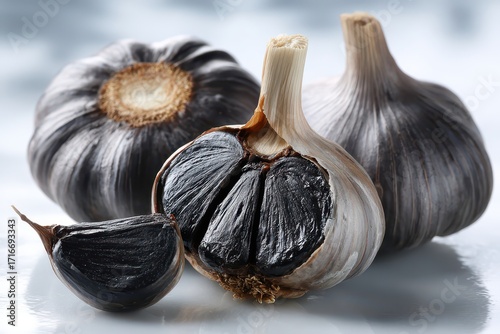 © whitestorm, Obraz premium Nutritious black garlic bulbs, one sliced open, revealing rich, dark cloves.
