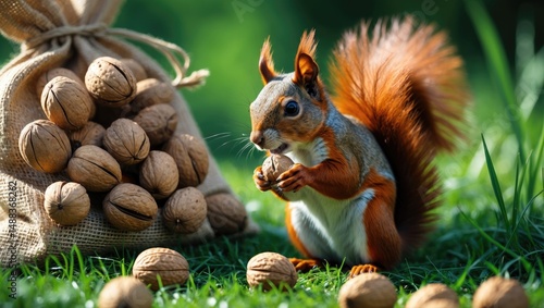 © AbstractAI, Obraz premium Nuts are eaten by a squirrel: A walnut bag as a squirrel's gift.