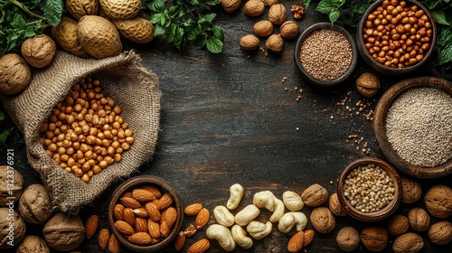 © WhimsyCreative, Fototapeta premium Nuts Spilling from Burlap Sack on Wooden Surface