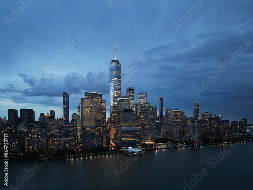 Obraz premium NYC aerial night view. New York City skyline, cityscape of Manhattan in USA. New York City NYC Manhattan Downtown Skyline, from Jersey City USA.