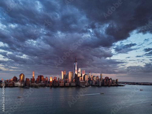 Naklejka premium NYC, New York City Skyline with dramatic sky. American Urban Skyscrapers USA near dramatic clouds. New York City skyline, cityscape of Manhattan in USA. Panoramic view on Manhattan. USA.