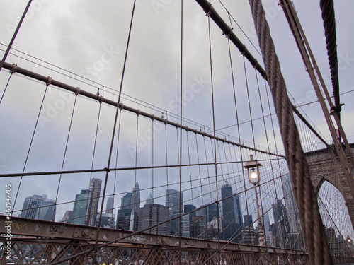 Obraz premium nyc skyline cityscape from the brooklyn bridge on a cloudy day