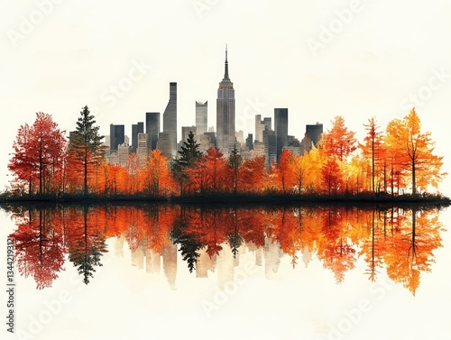 © Foxeye AI, Obraz premium NYC skyline reflected in autumnal lake. Perfect for travel, nature, and autumn themes.