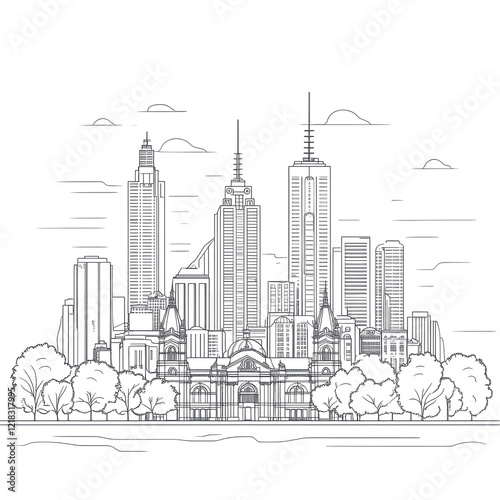 © Anha, Naklejka premium NYC Skyline Sketch Black White Cityscape Architecture Drawing
