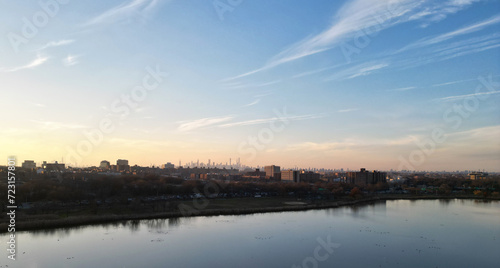 © Yuriy T, Fototapeta premium nyc skyline view in the distance at sunset (aerial drone shot from corona flushing meadows park in queens) midtown manhattan skyscrapers silhouette at golden hour (meadow lake, water) far away