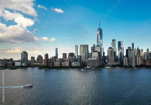 Obraz premium NYC skyline with skyscrapers aerial view. Manhattan and Brooklyn. New York City skyline with Hudson River views. Downtown NYC. New York from waterfront skyline. Panorama of of New York from top.