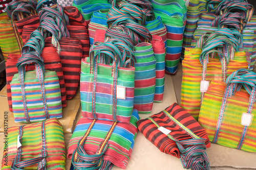 Fototapeta premium Nylonowa torba na koszyk Torba rybaka z siatki na Tajwanie Kolorowe torby na zakupy na sprzedaż na ulicy Dihua w Tajpej na Tajwanie