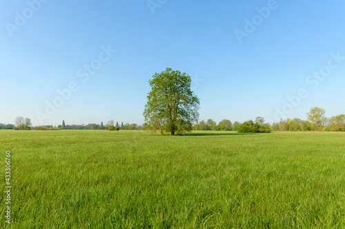 © bios48, Fototapeta premium Oak tree in a meadow in spring in a light green landscape.