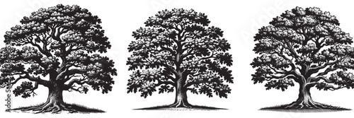 © Orion Draw, Obraz premium Oak tree in traditional woodcut drawing, black and white botanical illustration