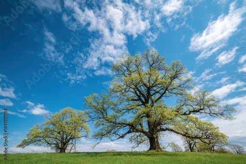 © VolumeThings, Fototapeta premium Oak trees in spring against a blue sky