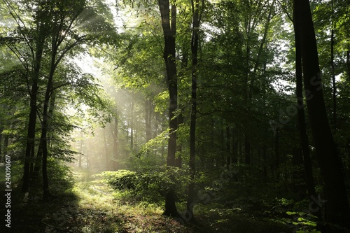 © Aniszewski, Fototapeta premium Oaks in the spring forest at dawn