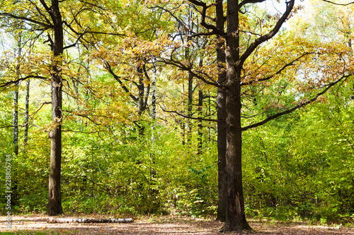 Fototapeta premium oaks on meadow in forest in sunny october day