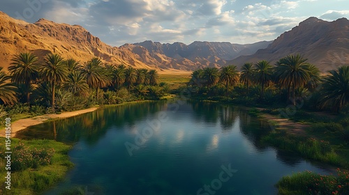 © Purnomo adi, Fototapeta premium Oasis in a mountain valley with palm trees and calm water reflecting the sky.