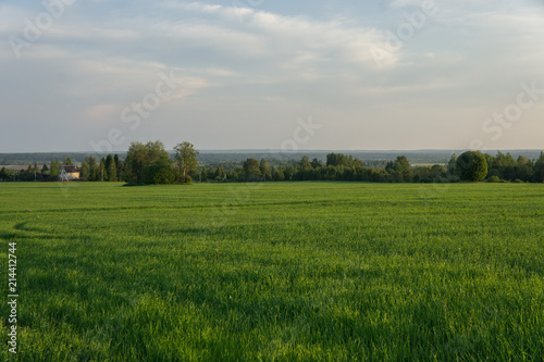 © aganda, Obraz premium Oat field at sunset of the spring sun.