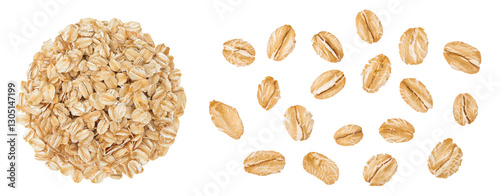 Obraz premium Oat flakes heap in isolated on white background with full depth of field. Top view. Flat lay