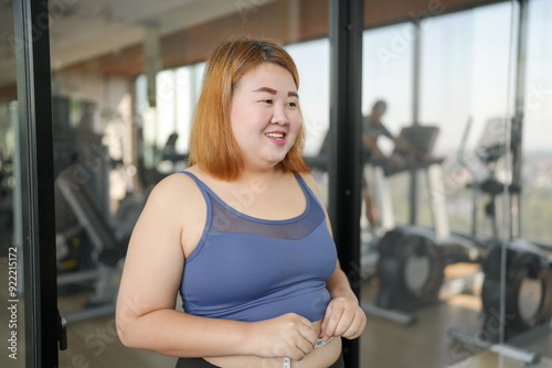 © Charlie's, Obraz premium Obese Woman with fat belly in dieting concept. Overweight woman touching his fat belly and want to lose weight. Fat woman waist with centimeter Shape up healthy stomach muscle.