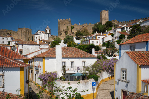 Obraz premium Obidos town featuring white houses, vibrant rooftops, and the impressive medieval castle under a blue sky. Portugal