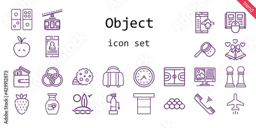 Fototapeta premium object icon set. line icon style. object related icons such as plane, fire extinguisher, smartphone, wallet, cookie, surfboard, cable car, book, strawberry, bag, wall clock