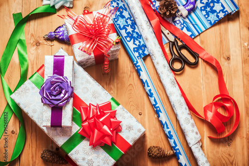© kurapatka, Fototapeta premium Objects for wrapping Christmas presents on wooden background