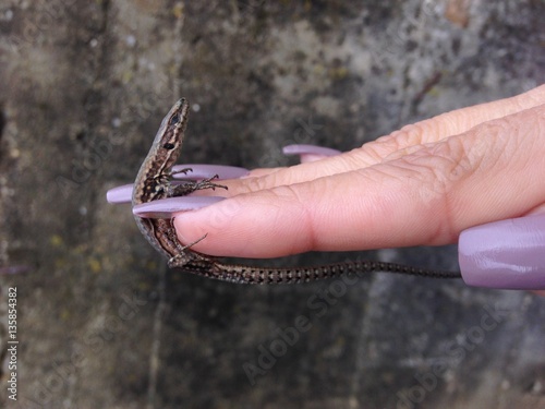 © poletant, Fototapeta premium Obraz małej jaszczurki gekon na kobiecej dłoni