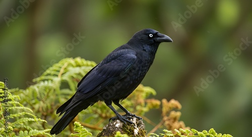 © almahyra, Fototapeta premium Observing a Torresian Crow Perched on a Rock with Lush Greenery
