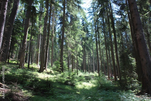 © BISO, Obraz premium Observing gorgeous pine deciduous forest trees