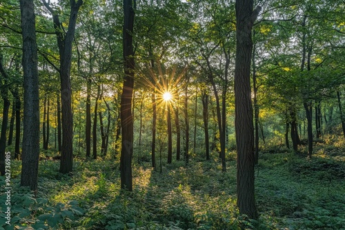© Dzikrul Husnani, Naklejka premium Observing the sun peeking through the trees in a forest is a serene experience, surrounded by terrestrial plants and a variety of shades of green and brown in the natural landscape, ai