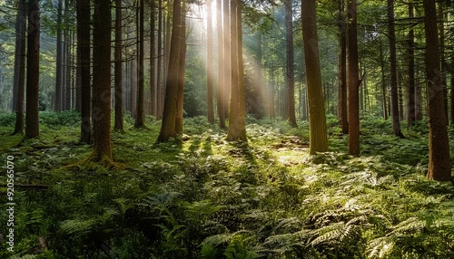Obraz premium Observing the sunlight filtering through the trees in a forest, surrounded by...