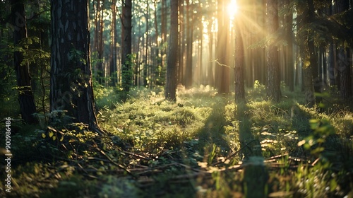 Fototapeta premium Observing the sunlight filtering through the trees in a forest surrounded by...