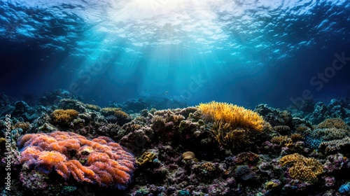Fototapeta premium Ocean acidification concept. Vibrant underwater coral reef with sunlight streaming through blue ocean water.