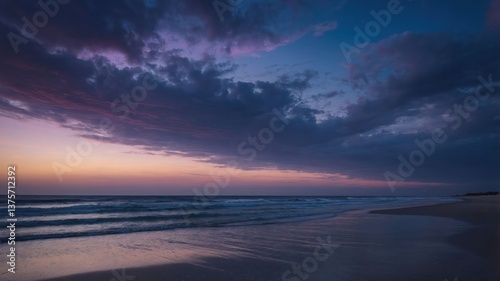 © AnisaHasby, Fototapeta premium Ocean Beach at Dusk Waves Rolling Under a Colorful Sky