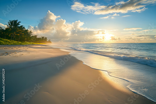 © momostudio, Fototapeta premium Ocean beach with waves trees and clouds at sunrise or sunset.
