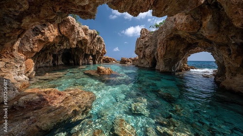 © dong, Fototapeta premium Ocean Cave Entrance with Turquoise Water and Blue Sky. Enchanting and Serene Coastal Scene.