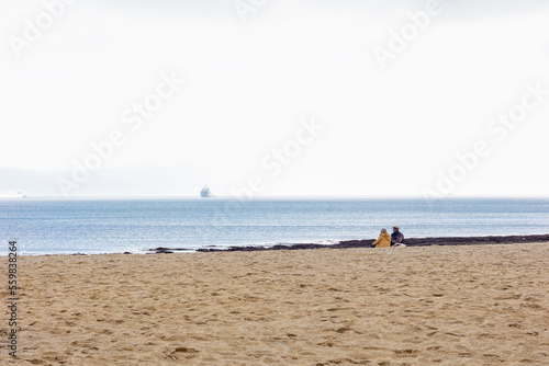 Fototapeta premium Ocean coast couple sitting on the sand, cruise ship on the horizon