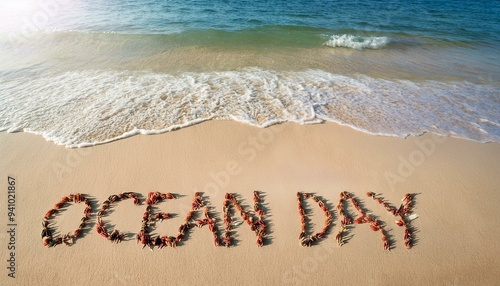 Fototapeta premium Ocean day text written in sand on a beach