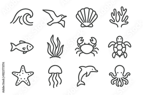 Fototapeta premium Ocean Elements Icons. Line style icons of ocean elements: cresting wave, seagull, shell, coral; fish, seaweed, crab, turtle;