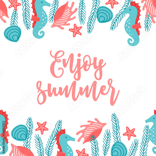 Obraz premium Ocean greeting card with seamless border - starfish, shell, seahorse, seaweed