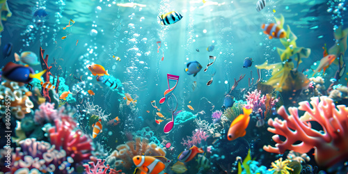 Naklejka premium Ocean Melodies: Music Notes Drifting in the Sea with Marine Life and Coral Reefs