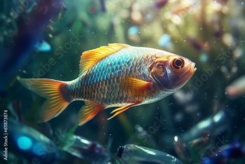 Fototapeta premium Ocean plastic pollution. Underwater world with plastic debris at the bottom. Ecological problem. AI generated