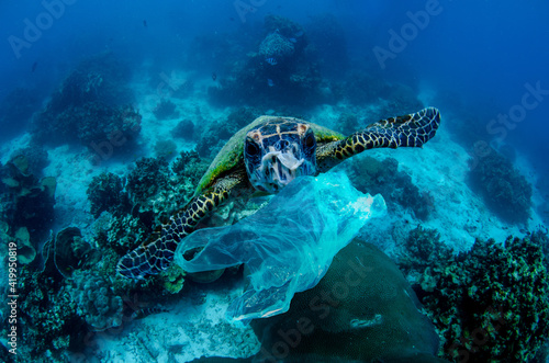 Fototapeta premium Ocean pollution a Sea turtle mistakes a plastic bag for food.