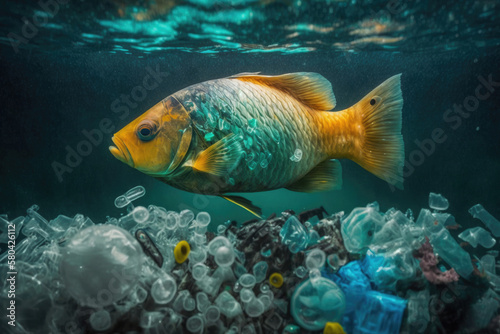 © Lazy_Bear, Naklejka premium Ocean pollution concept. Fish under water in sea and plastic waste. Problem in environmental system. Created with Generative AI