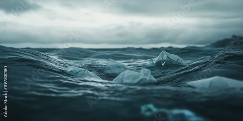 Fototapeta premium Ocean pollution with floating plastic bags and environmental impact concept