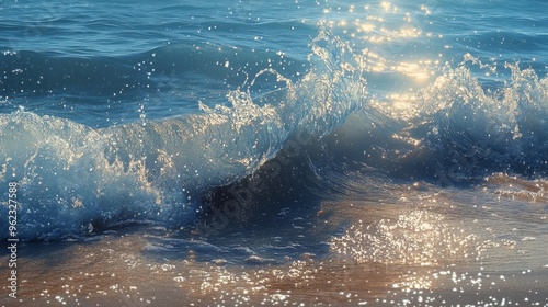 © Elshad Karimov, Obraz premium Ocean ripples roll towards the shore, blurring with the mist from a breaking wave. Glistening highlights scatter in the distance.