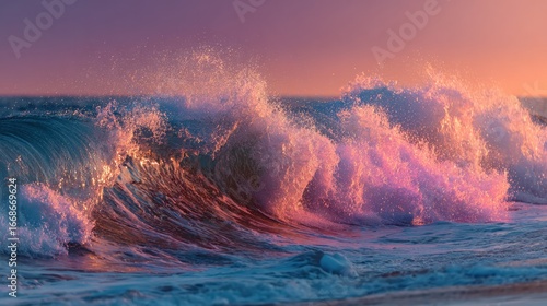 © Putt_Sanplee, Naklejka premium Ocean's Embrace: Witness the raw power and serene beauty of the ocean as a colossal wave crashes. Capturing a moment of natural artistry, with the sky ablaze in hues of pink and orange.