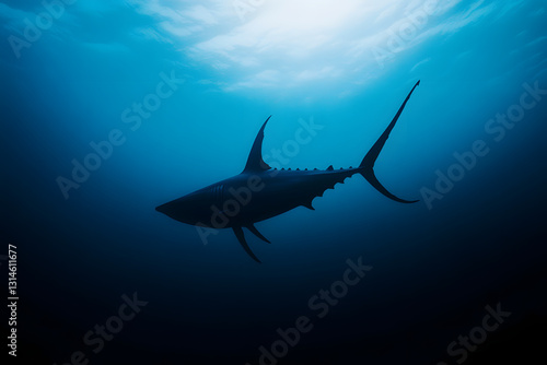 Fototapeta premium Ocean's Enigma: Shark Silhouette in Deep Blue Waters