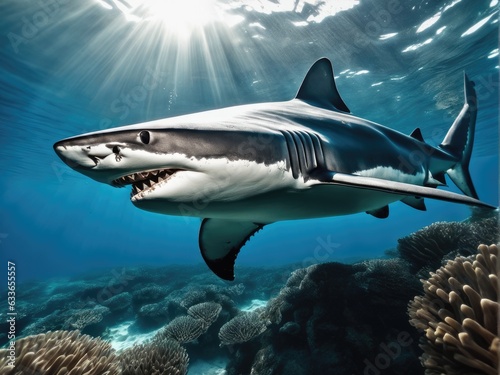 Fototapeta premium Ocean shark bottom view from below. Open toothy dangerous mouth