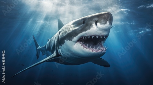 Fototapeta premium Ocean shark bottom view from below. Open toothy dangerous mouth with many teeth. Underwater blue sea waves clear water shark swims forward
