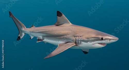Obraz premium Ocean shark bottom view from below. Open toothy dangerous mouth with many teeth. Underwater blue sea waves clear water shark swims , Shark Under Water